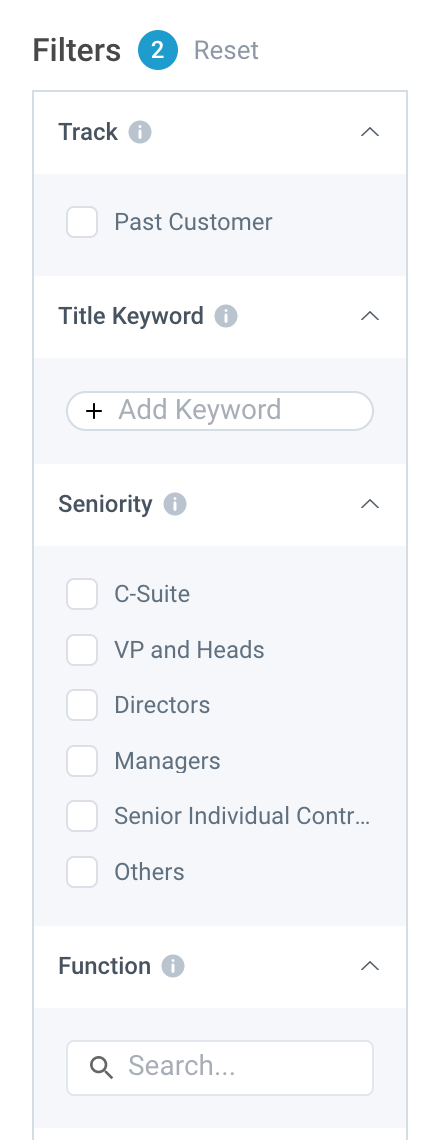- You can filter your prospects on the right side panel. You will have options to filter by past customers (any Accounts in Salesforce that have a closed-won opportunity attached) as well individual prospect filters such as Title, Seniority, and Function.