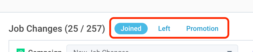 - At the top of the Track page you can select from 3 different views to see prospects who have joined your targeted accounts, prospects who have left your targeted accounts, and those who have been promoted