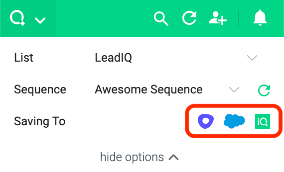 - Confirm you have your integrations connected. At the top of the extension you will see icons for your integrations if they have been connected to your LeadIQ account: