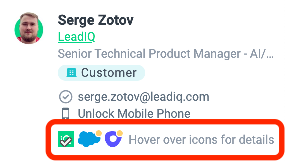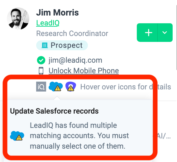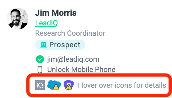 - You can hover over the icon and LeadIQ will tell you why this prospect was not synced. the notification bell on the top right corner of the LeadIQ extension.