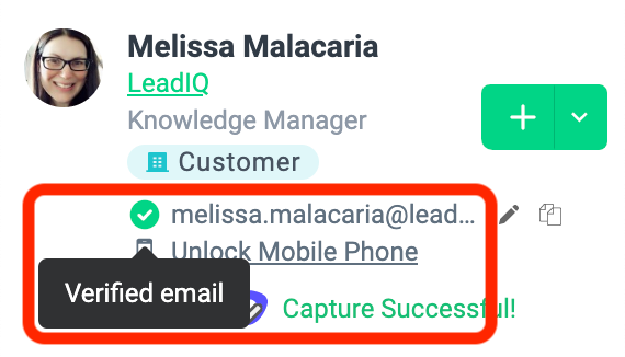 - LeadIQ will verify emails as you are capturing your prospects. We will show a symbol next to the email with our confidence level (hover over the icon to see more):