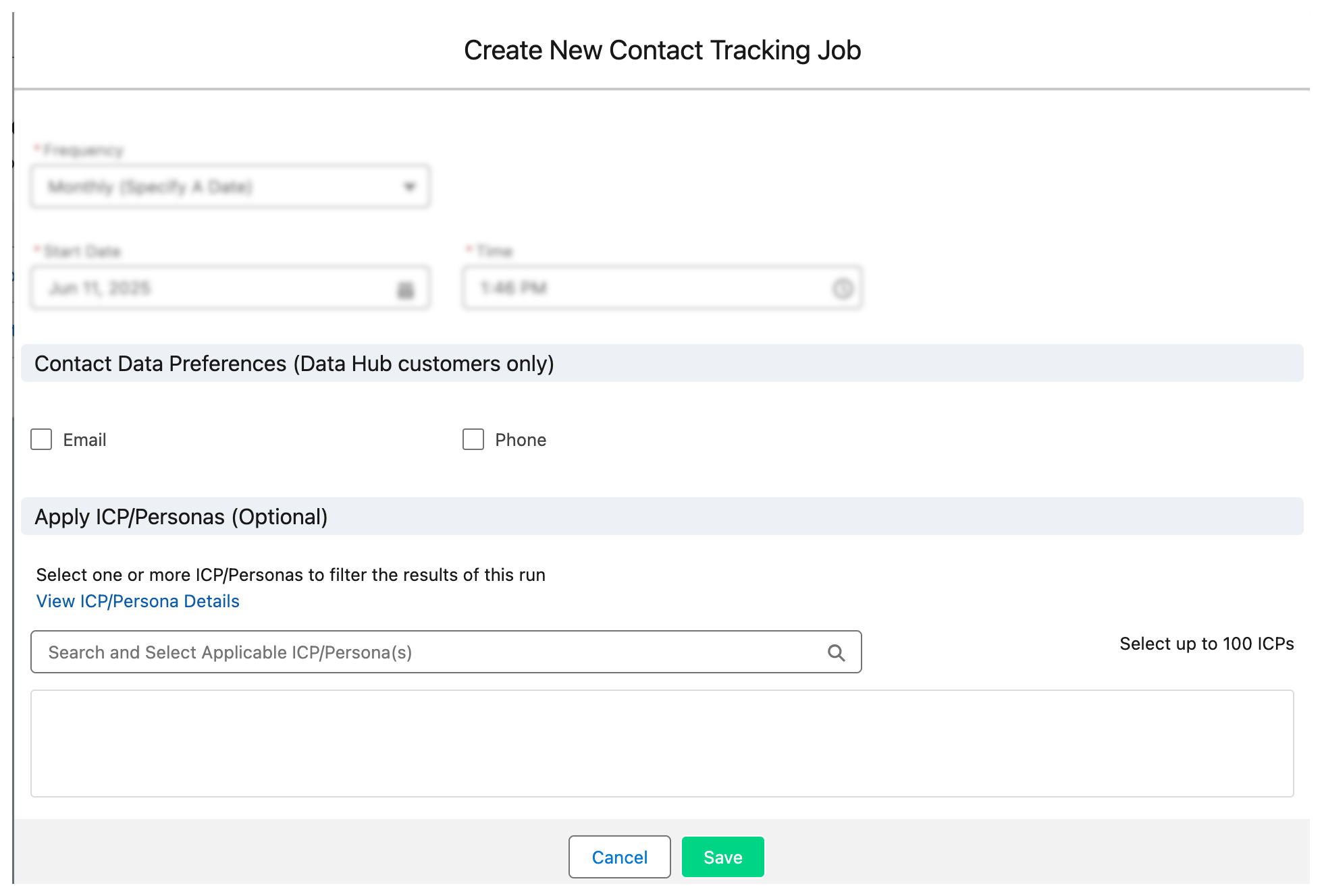 - [Optional] Select your desired ICP/Personas that you'd like the results to be aligned with. Clicking on the search bar will display the list of ICP/Personas set up on the web app. If no ICP/Persona(s) is selected, all defined ICP/Personas will be considered in scope for this job run.