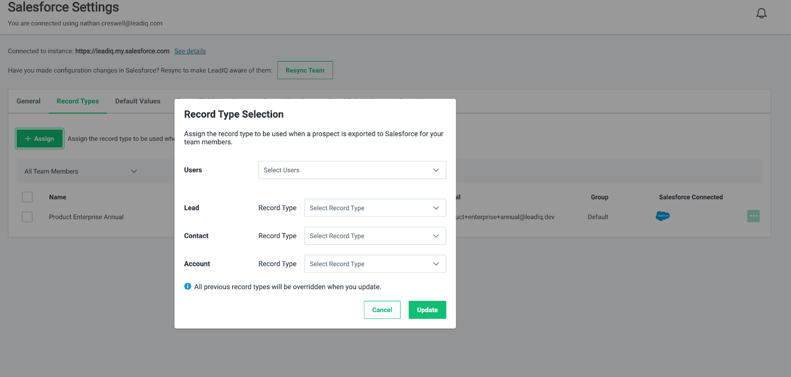 This feature allows LeadIQ Admins to assign different record types to different users depending on the object (account, contact, or lead) being imported. Admins to control how data captured in LeadIQ is imported into the CRM by assigning record types to different users or groups of users.