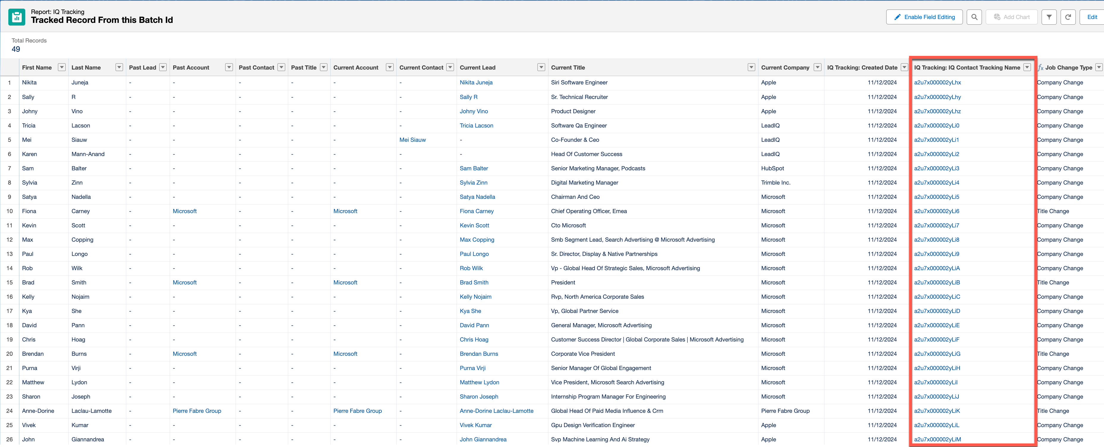 You will see the results in the form of contacts that joined or had a title change within each account in your list. For each contact found to have met this criteria, a new custom object called IQ Contact Tracking object will be added to your Salesforce.
