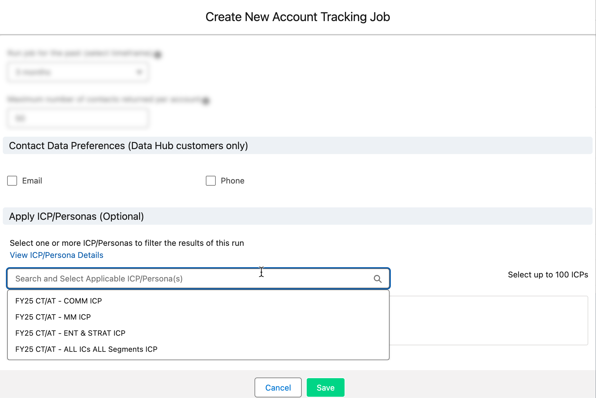 - [Optional] Select your desired ICP/Personas that you'd like the results to be aligned with. Clicking on the search bar will display the list of ICP/Personas set up on the web app. If no ICP/Persona(s) is selected, all defined ICP/Personas will be considered in scope for this job run.