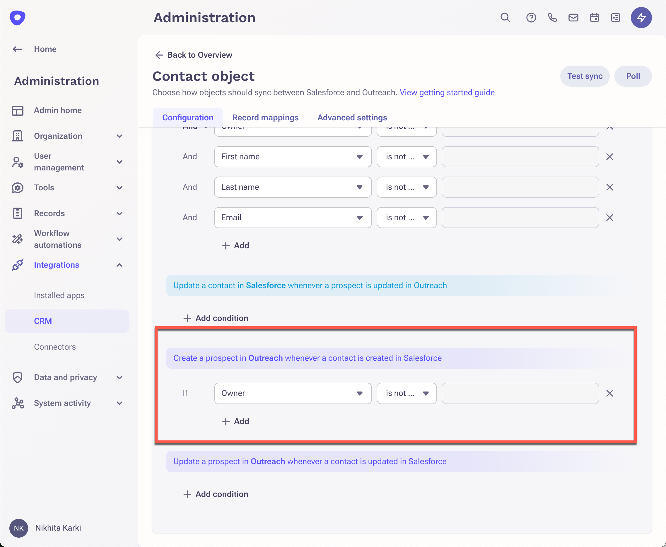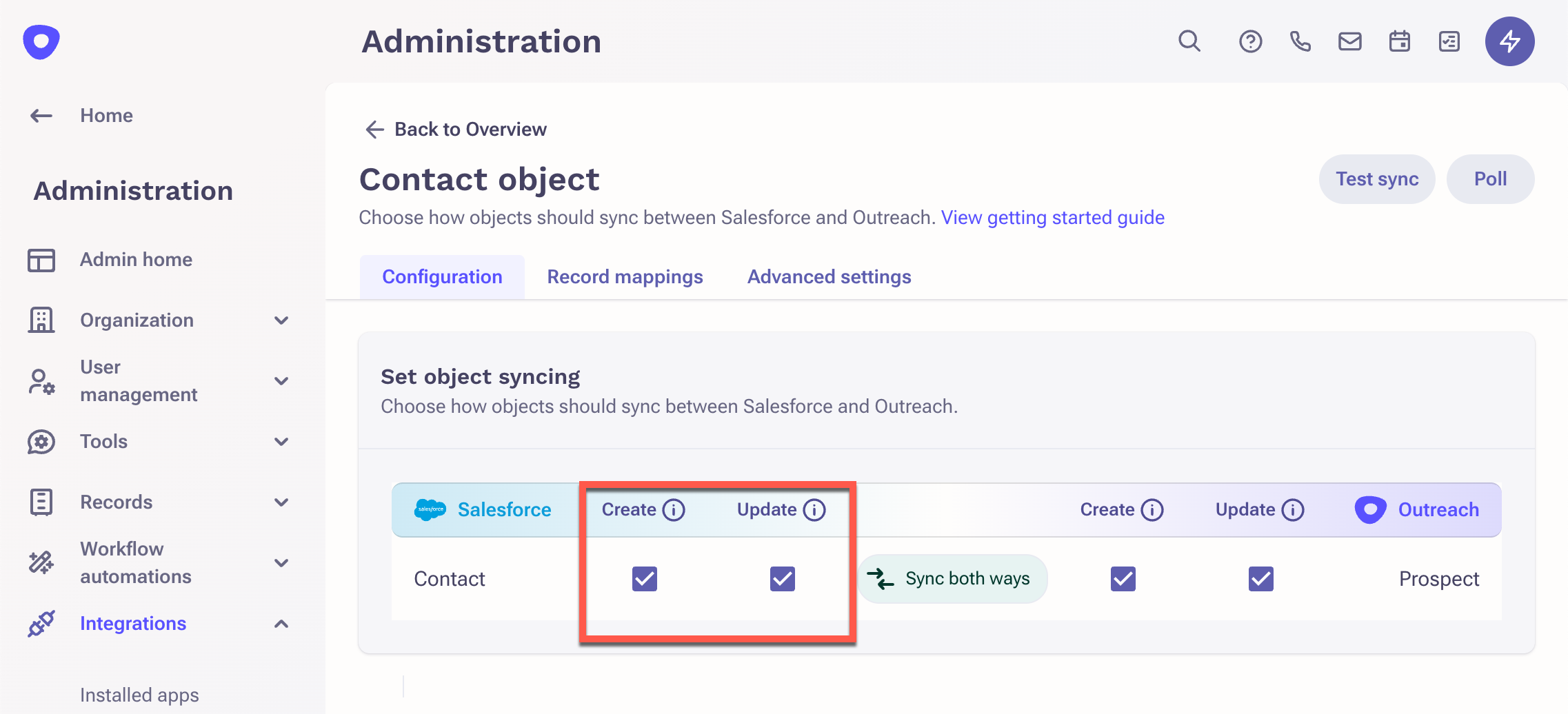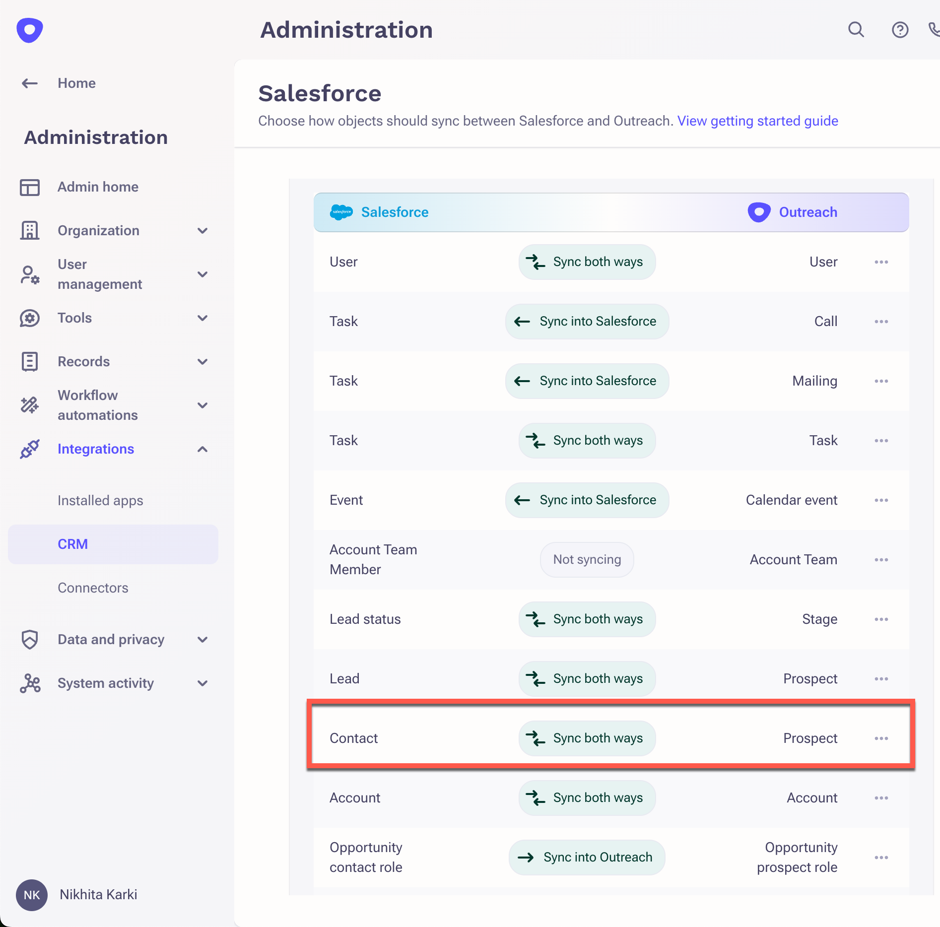 2. Scroll down on the page to confirm that the Contact object is being synced to Outreach from Salesforce.