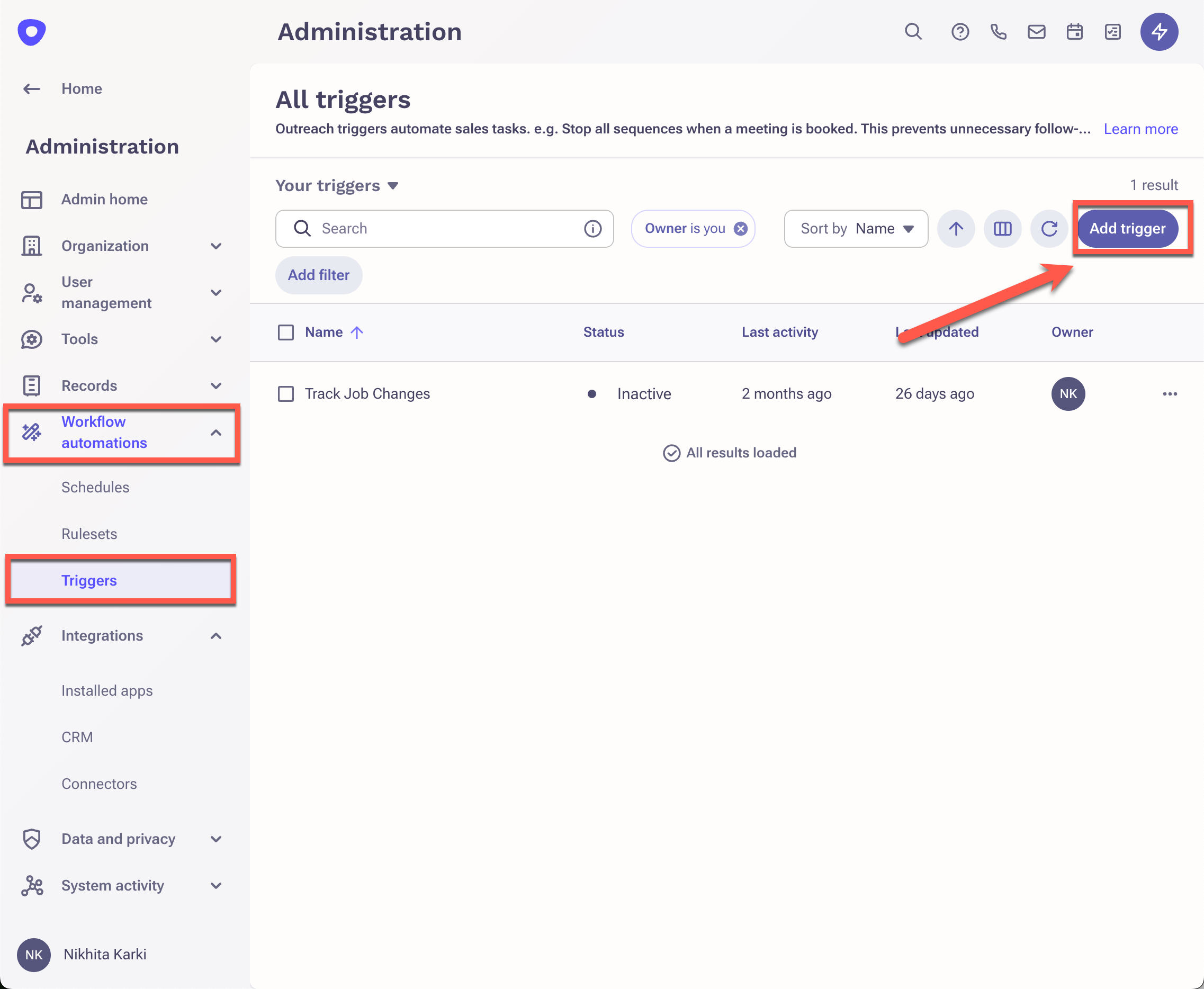 1. On Outreach, navigate to Workflow Automations --> Triggers --> Add Trigger