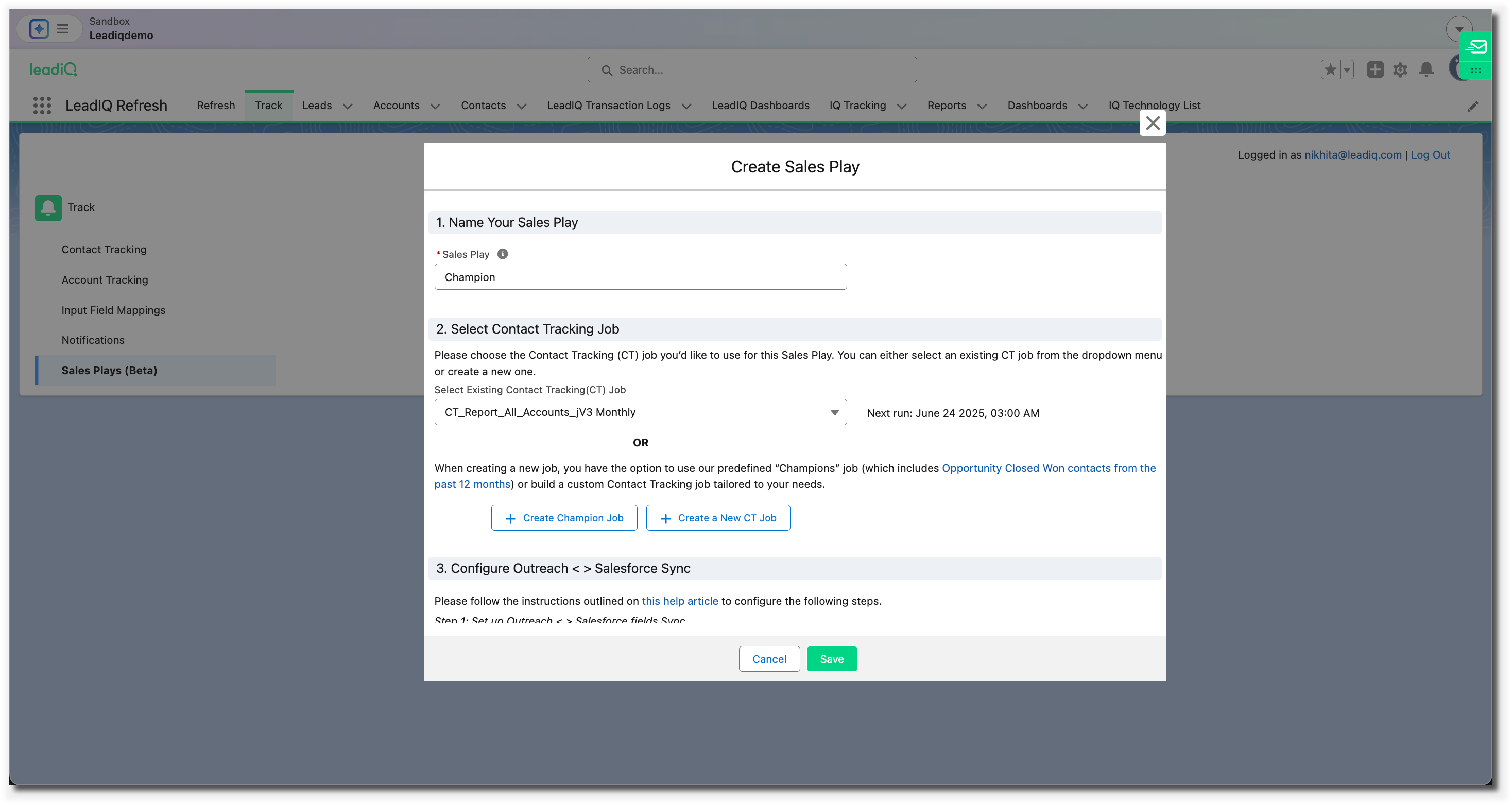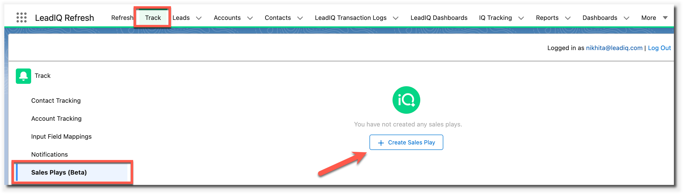 To get started, please navigate to the Salesforce LeadIQ app --> Track --> Sales Plays (Beta) --> Create Sales Play